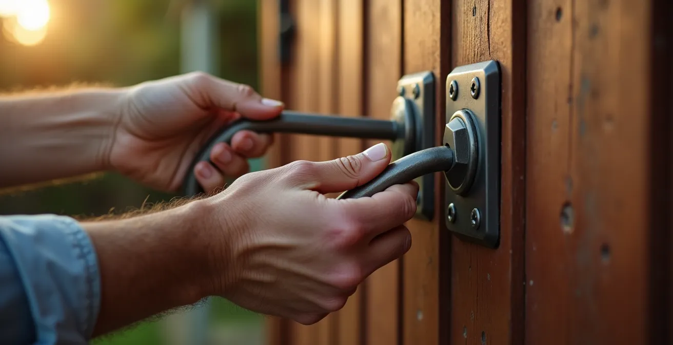 Les cinq erreurs d’installation les plus fréquentes compromettent systématiquement l’efficacité des dispositifs. Fixer un verrou sur un point faible comme du bois pourri ou de la tôle fine crée un ancrage qui cédera avant le dispositif lui-même. Utiliser la visserie fournie avec le produit, souvent sous-dimensionnée pour réduire les coûts, permet un arrachement facile. Positionner le verrou trop près du bord de la porte réduit la surface de résistance et facilite l’effet de levier. Laisser les charnières accessibles depuis l’extérieur rend le verrouillage inutile puisque la porte peut être retirée sans le forcer. Négliger l’espace sous la porte permet le passage d’un pied de biche ou d’outils de crochetage.